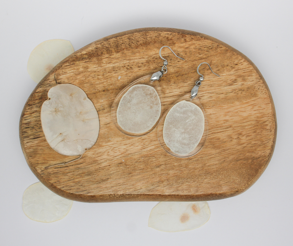 Légèrement nacrées et transparentes ces capsules de graines sont difficiles à travailler, très fragiles mais si belles immortalisées dans la résine.
